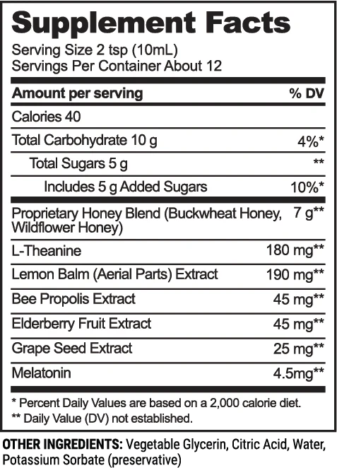 Unpasteurized buckwheat honey, elderberry fruit extract, bee propolis extract, melatonin, L-theanine, lemon balm extract, grape seed extract, glycerin, purified water, citric acid, potassium sorbate